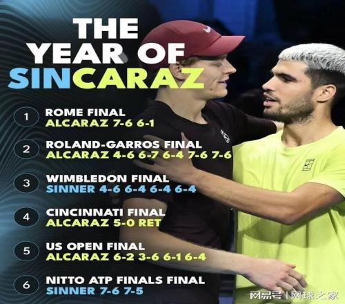 其五、今年都靈ATP年終總決賽最后的決賽,辛納兩盤見七(7:6 7:5)戰(zhàn)勝阿爾卡拉斯,衛(wèi)冕成功,于是風向突然為之一變,揚辛抑阿之言,一時此起彼伏。