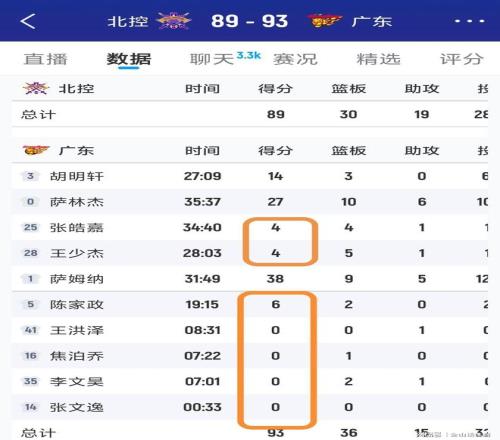 值得一提的是,在這場(chǎng)比賽中,廣東隊(duì)的國(guó)內(nèi)球員,在場(chǎng)上均表現(xiàn)得乏善可陳。全場(chǎng)比賽,小外援薩姆納砍下38分,大外援薩林杰砍下27分,“雙薩組合”合砍65分,但全隊(duì)9名本土球員,才得了27分。這其中,首發(fā)出場(chǎng)的張皓嘉和王少杰各得4分,胡明軒雖然上雙得了14分,但效率偏低,場(chǎng)上正負(fù)值-10。5個(gè)替補(bǔ)中,就陳家政得了6分,剩余4人,王洪澤、焦伯喬、李文昊、張文逸,均為0分。