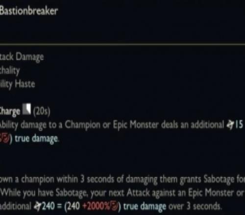 S16刺客裝備【破壘者】效果:參與擊殺后可對(duì)野怪防御塔造成一次高額真?zhèn)?/p>